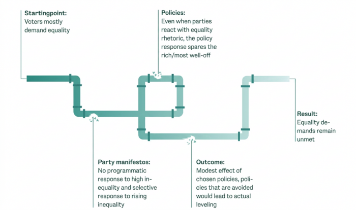 Our stylized findings so far are summarized in the leaky equality pipeline shown on this page. Equality, despite public demand, gets lost in transmission at three stages of the policy process: programmatic response, selective policy responses, and the varying impacts of policies on different types of (in)equality. For details, please consult our publication page.